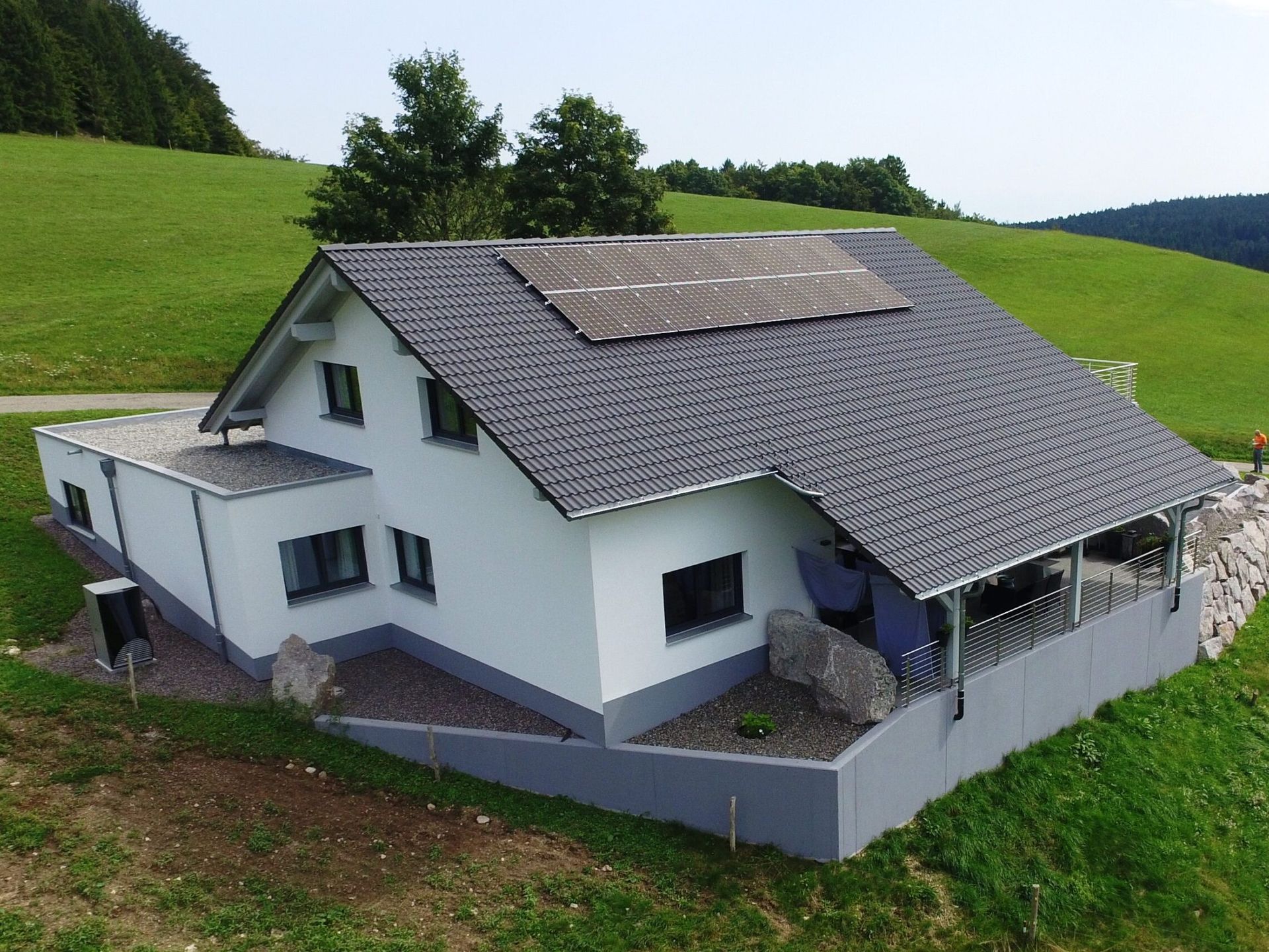 Das schöne Einfamilienhaus liegt im Ortsteil Dachsberg-Ruchenschwand. Das Haus wurde exakt auf die Bedürfnisse der Bauherrschaft geplant. Das Projekt umfasste insgesamt 259 qm Wohnfläche. Die Bauherrschaft wünschte sich ein Einfamilienhaus mit großer Garage. Die Bodenplatte und die Geschossdecken wurden in Stahlbeton ausgeführt. Die restlichen Wände wurden mit Ziegelstein aufgemauert. Die Bauherrschaft hat alle Trockenbauarbeiten in Eigenregie ausgeführt. Im Erdgeschoss befindet der schöne Eingangsbereich mit Gäste WC, HWR, zwei Schlafzimmer, Bad, Küche und ein offener Wohn/Esszimmerbereich. Über den Wohnbereich hat man direkten Zugang auf die Terrasse. Über die Metall-Holztreppe gelangt man in das Dachgeschoss, hier befinden sich Büro, Fitness, DU/WC und ein großer Schlaf-Wohnraum mit Küchenzeile. Es entstand ein schönes Wohnhaus in idyllischer Lage.